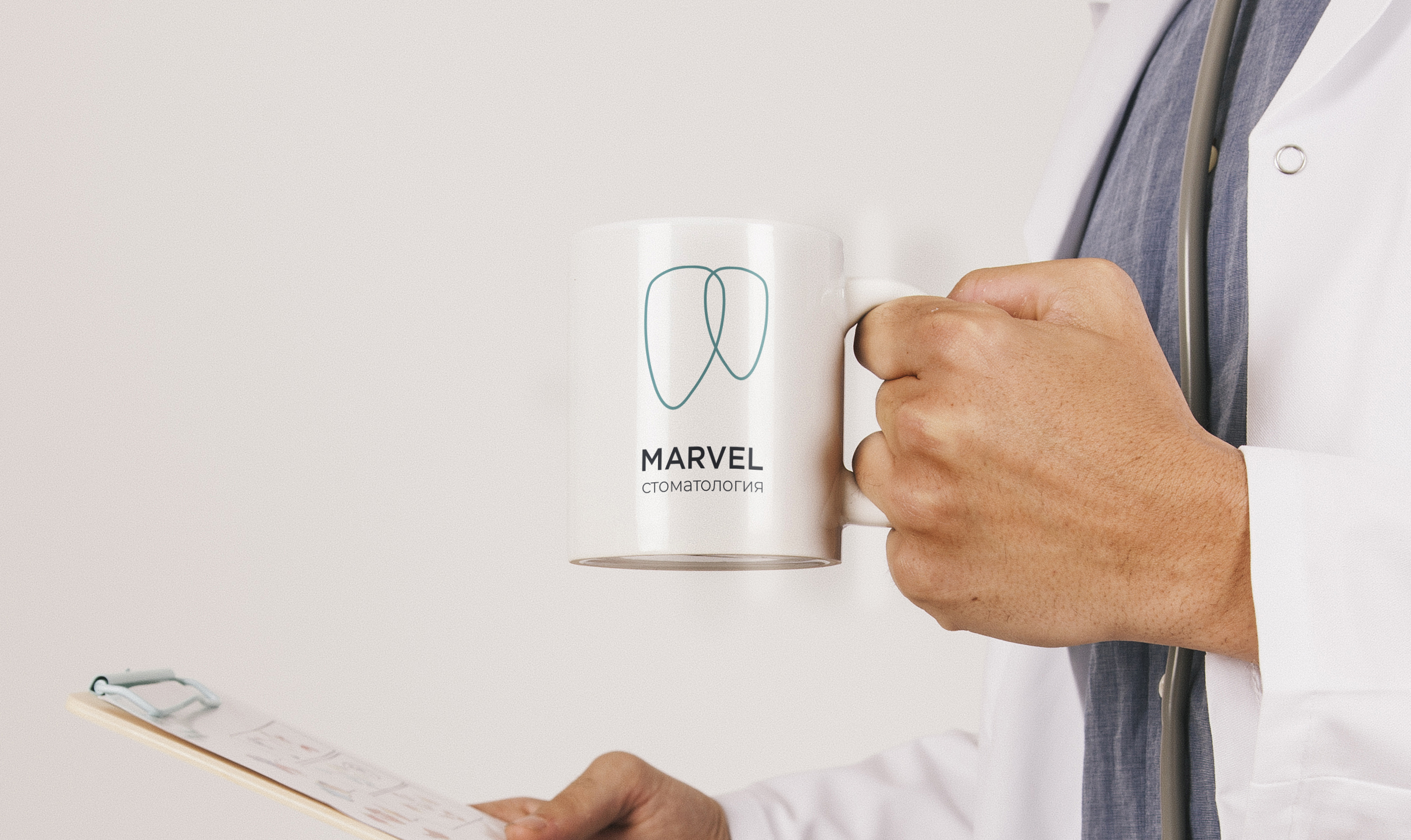 Представили, как стоматолог пьет чай. Определились с цветами, дорисовали различные варианты логотипа.
