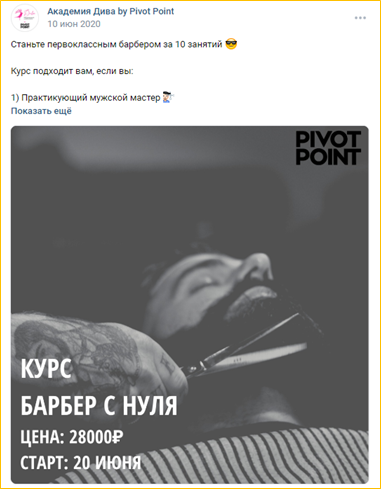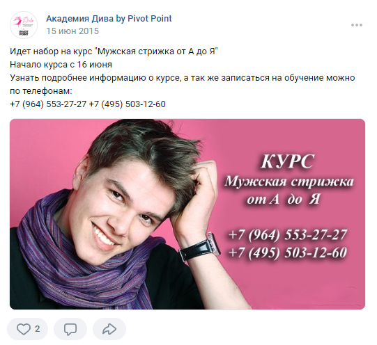 Соцсети уже были созданы, а вот развитие все никак не начиналось. Добавили немного скриншотов, чтобы была понята их специфика. Кроме стрижек, можно было записаться на курсы по маникюру, шугарингу и пр. СТРИЖКИ были главным направлением.