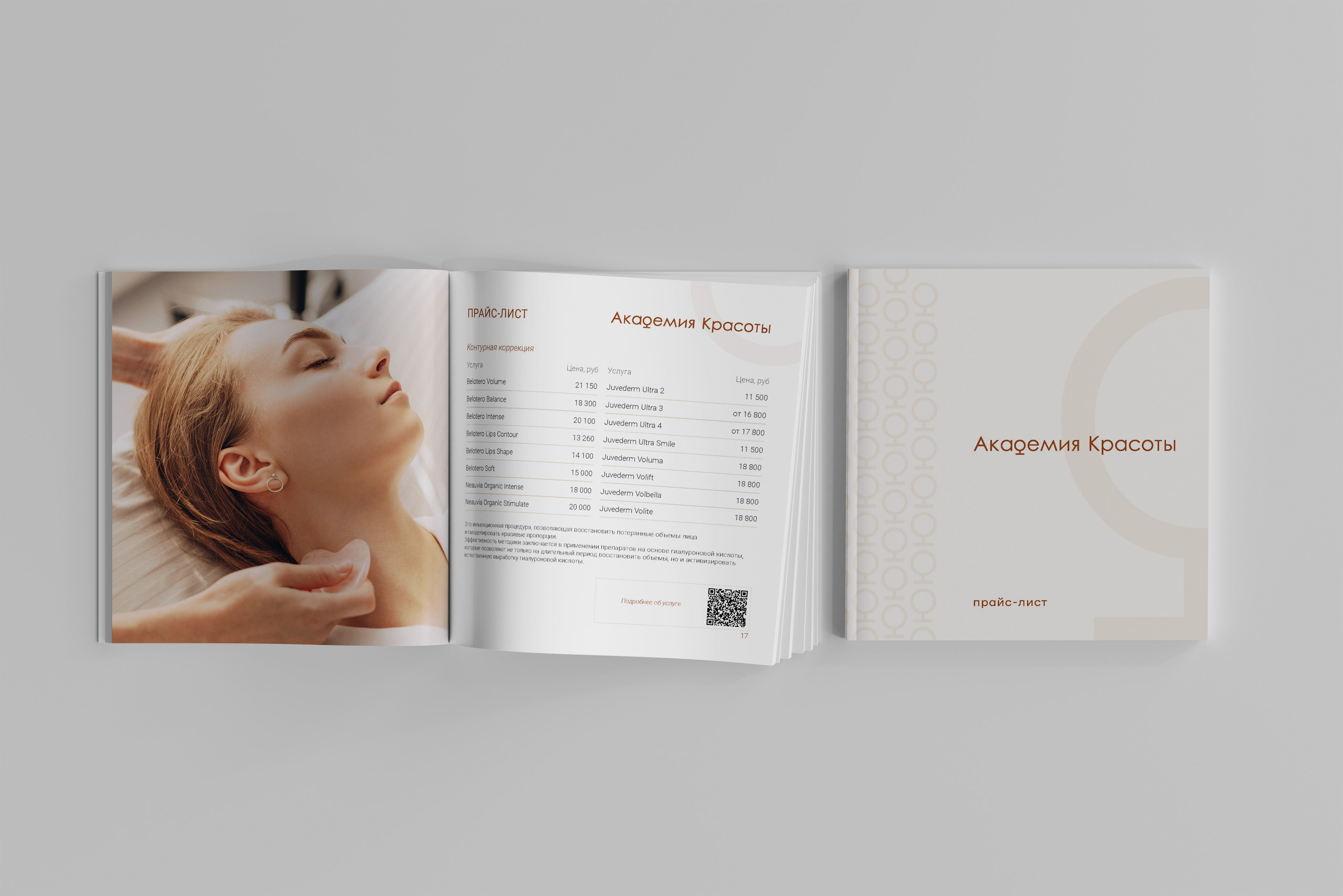 Оформить прайс-лист в фирменном стиле, подобрать образы в соответствии с разделами прайса, а их было приличное количество. Добавить важную информацию, если ее много, добавить qr-коды с ссылками на сайт, где клиент может подробнее узнать про ту или иную процедуру.