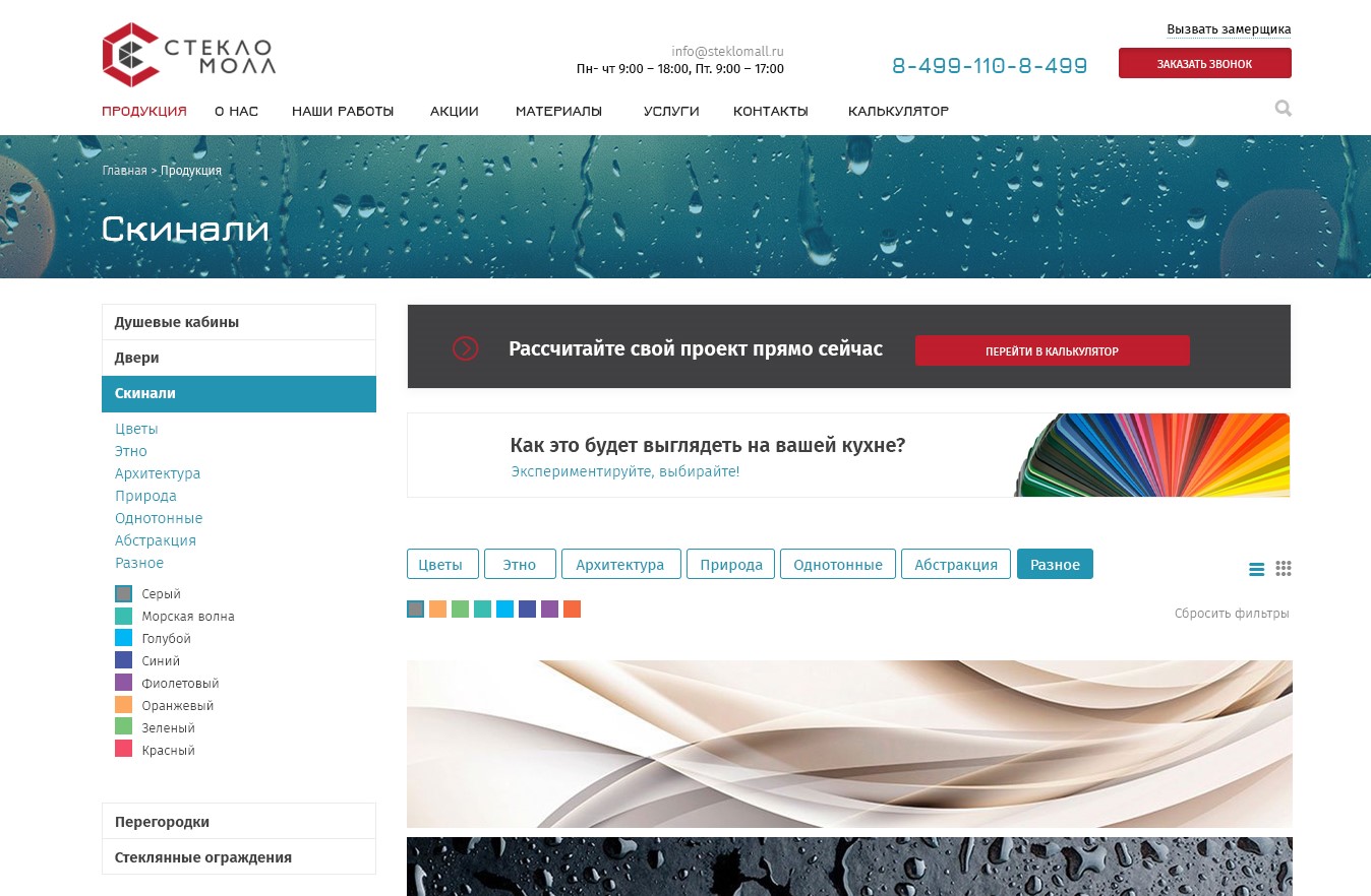 Компания специализируется на фотопечати и изготовлении различных изделий из стекла, включая стеклянные перегородки, скинали, душевые кабины и другие подобные изделия. На первоначальном этапе нашей работы стояла задача разработать фирменный интерфейс сайта, который будет привлекательным и легким в использовании, и при этом будет соответствовать потребностям наших клиентов. Была поставлена задача разработать калькулятор, который поможет клиентам быстро оценить стоимость товара в основных разделах нашей продукции.